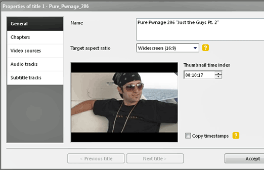 Questo è dove sarete facendo un sacco di vostra personalizzazione. Si sta andando a voler dare un nome al video e assicurarsi che sia impostato alle proporzioni corrette. In Capitoli, è possibile specificare la lunghezza di ogni capitolo. Per qualcosa di lungometraggio questo potrebbe essere di cinque o dieci minuti, ma per un video di questo breve, ho impostato i miei capitoli a due minuti. In Sorgenti audio e video, è possibile includere un’angolazione diversa di uno scatto, se disponibile, o una traccia audio alternativa, ad esempio il commento.