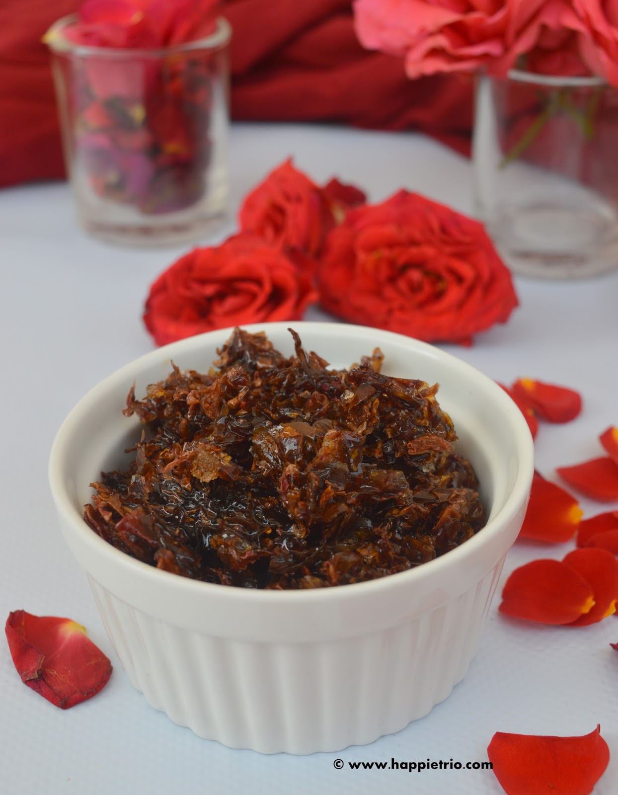 Gulkand oder Rosenblütenmarmelade ist ein gesunder Aufstrich aus Rosenblättern zusammen mit Zucker.