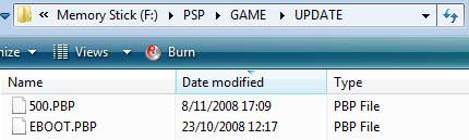 このファイルをダウンロードし、EBOOTに名前を変更します。PBPをX:PSPGAMEUPDATEに入れます(X:をPSPにします)。 次に、Game->Memory Stick┢に移動し、”PSP┢Update ver3.03″を開きます。