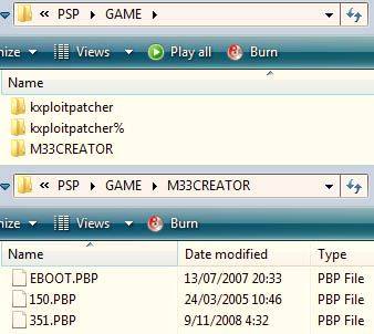 m33CREATORフォルダを3.52m33rarからm33CREATORフォルダにコピーします。X:/PSP/GAME (ここで、X:はあなたのPSPです)。 1.50と3.52EBOOTファイルの名前をそれぞれ150に変更します。PBPおよび352。PBPと同様にM33CREATORにそれらを移動します。